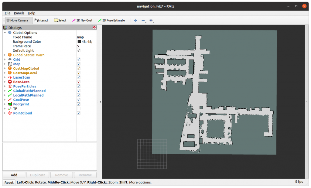 Run rosrun rviz rviz -d navigation.rviz to open rviz.